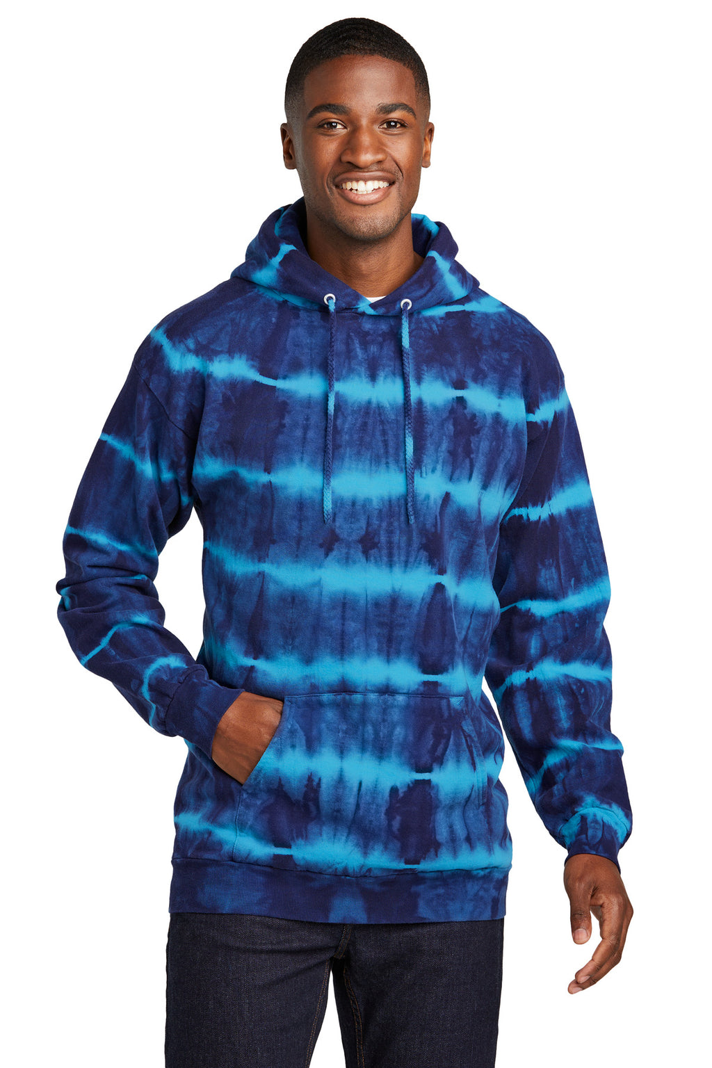 A pattern of dark, inky single-color hues mixed with color-on-color tones makes this fleece hoodie a true tie-dye standout. 7.8-ounce, 80/20 cotton/poly fleece 100% cotton face Sewn with dyeable thread Individually hand dyed Self-fabric lined hood Dyed-to-match drawcords Front pouch pocket Removable tag for comfort and relabeling The tie-dye process infuses each garment with unique character. Please allow for slight color variation.