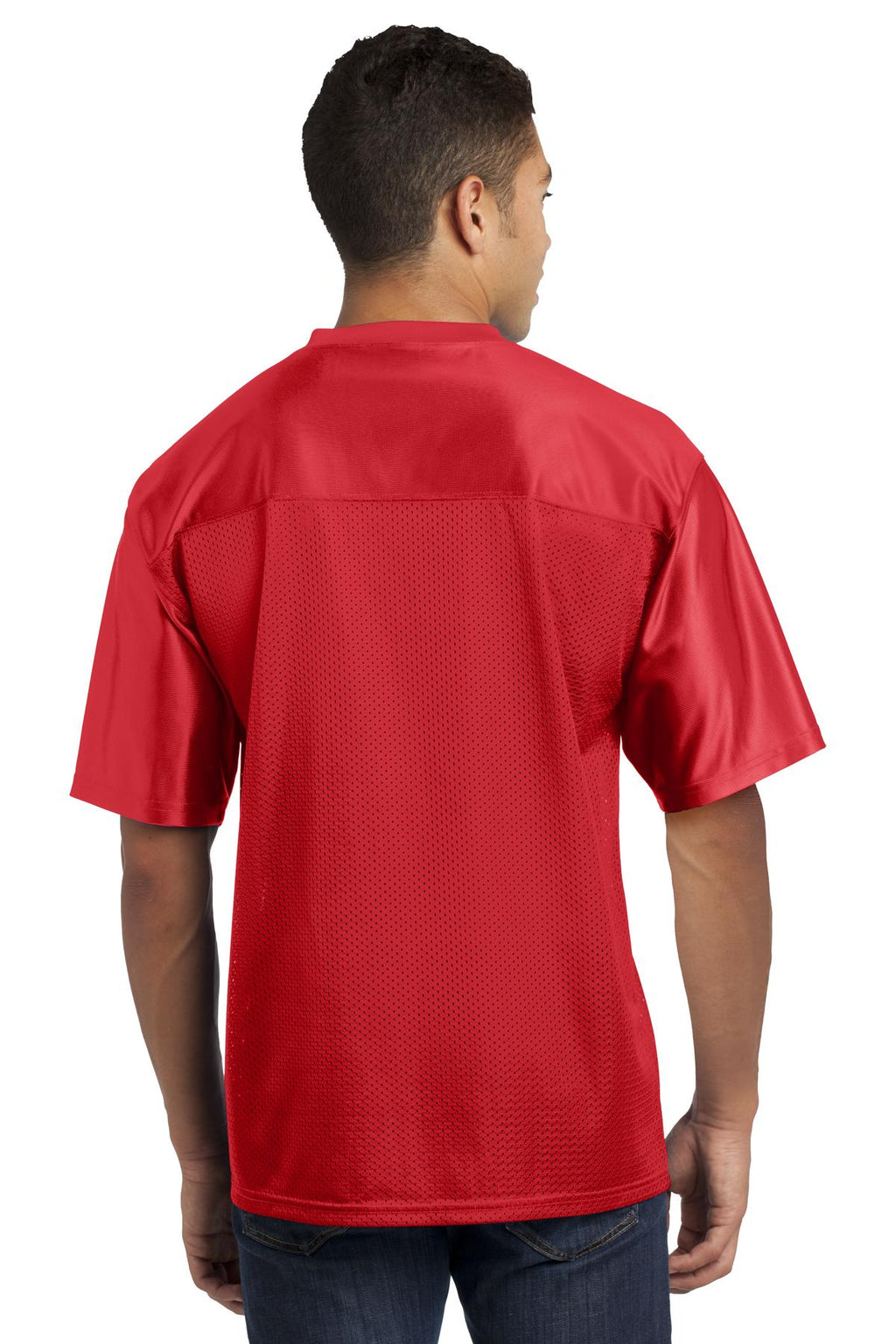 True athletic-looking jerseys featuring a breathable mesh body and color-locking PosiCharge technology. | 3.6-ounce, 100% polyester mesh body with PosiCharge technology 4.1-ounce, 100% polyester dazzle yoke and sleeves with PosiCharge technology Removable tag for comfort and relabeling Crossover rib knit V-neck Set-in sleeves Not designed to be worn over pads